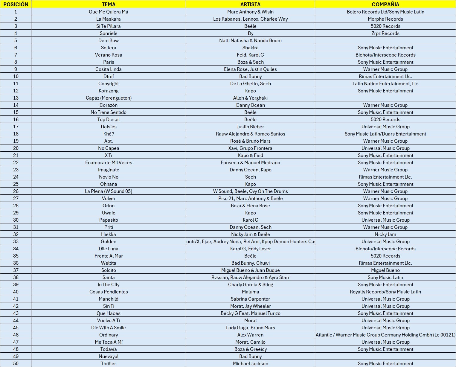 TOP 50 INTERNACIONAL DEL 09 DE OCTUBRE AL 16 DE OCTUBRE DEL 2025