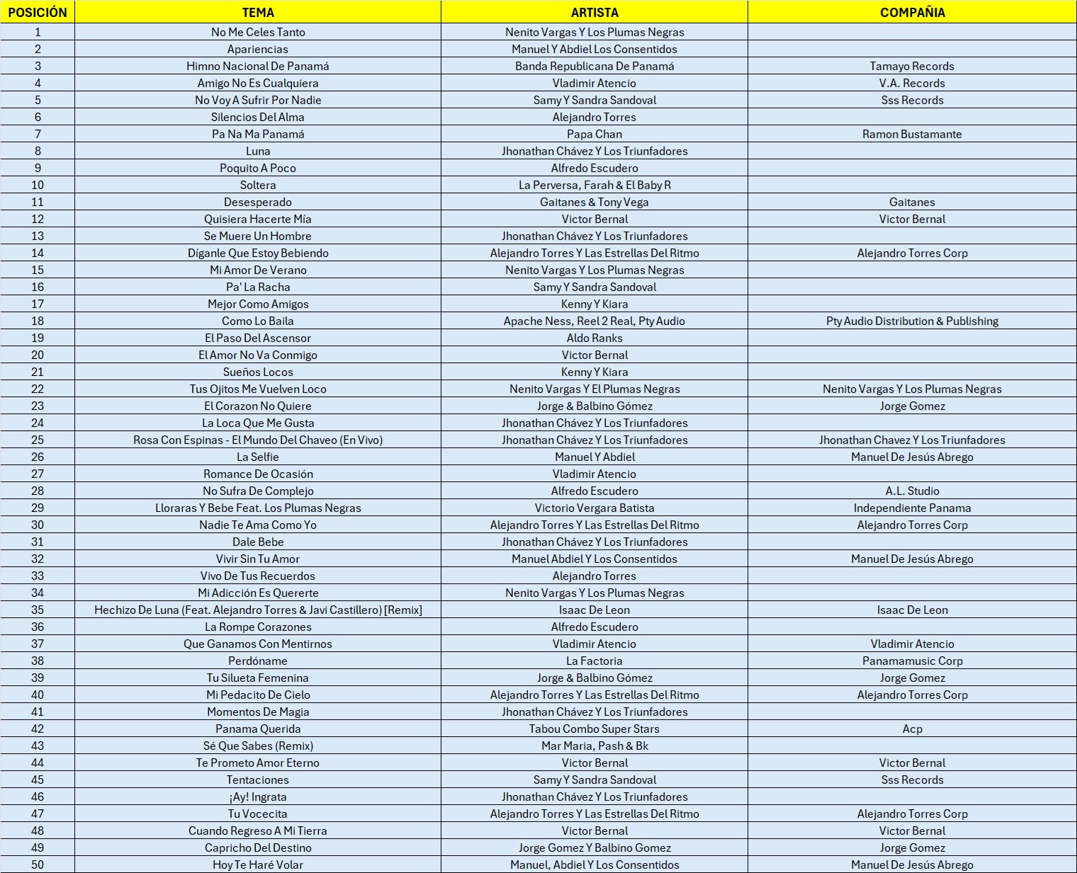 El contenido de esta lista abarca los temas musicales más sonados en el territorio nacional la cual está compuesta por NUESTROS SOCIOS y por aquellos que aún no forman parte de NUESTRA SOCIEDAD.