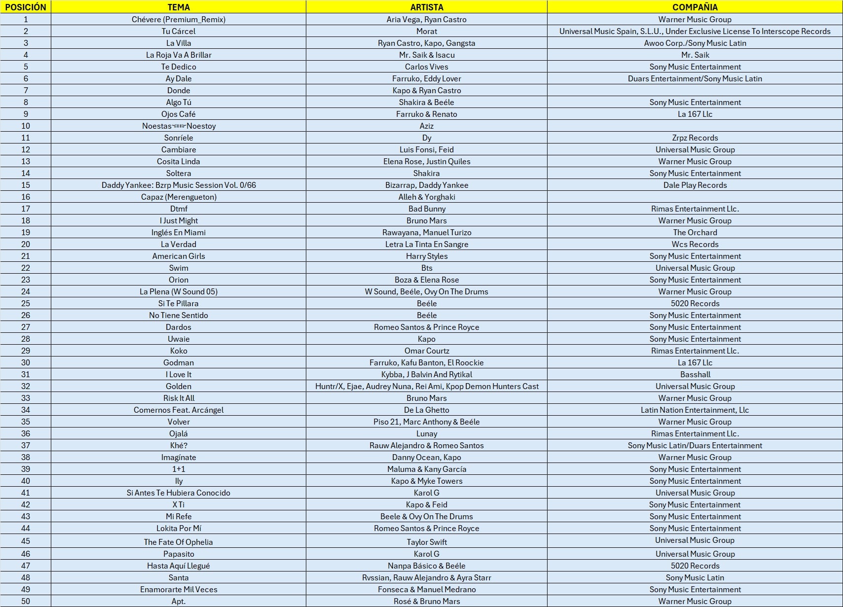 El contenido de esta lista abarca los temas musicales más sonados a nivel internacional la cual está compuesta por NUESTROS SOCIOS y por aquellos que aún no forman parte de NUESTRA SOCIEDAD.