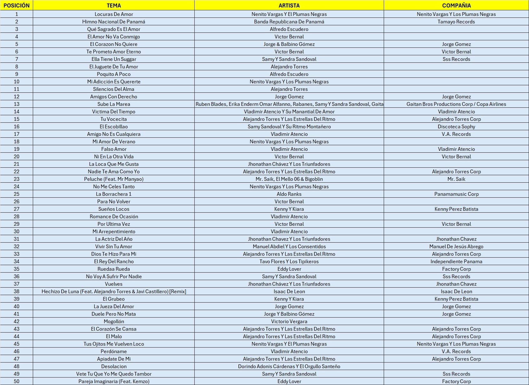 Monitoreo realizado por la Empresa BMAT de Barcelona a 60 Canales vía Streaming de la República de Panamá entre emisoras y canales de televisión locales. Para ser considerados una tocada el tema debe haber sonado durante 50 segundos como mínimo.